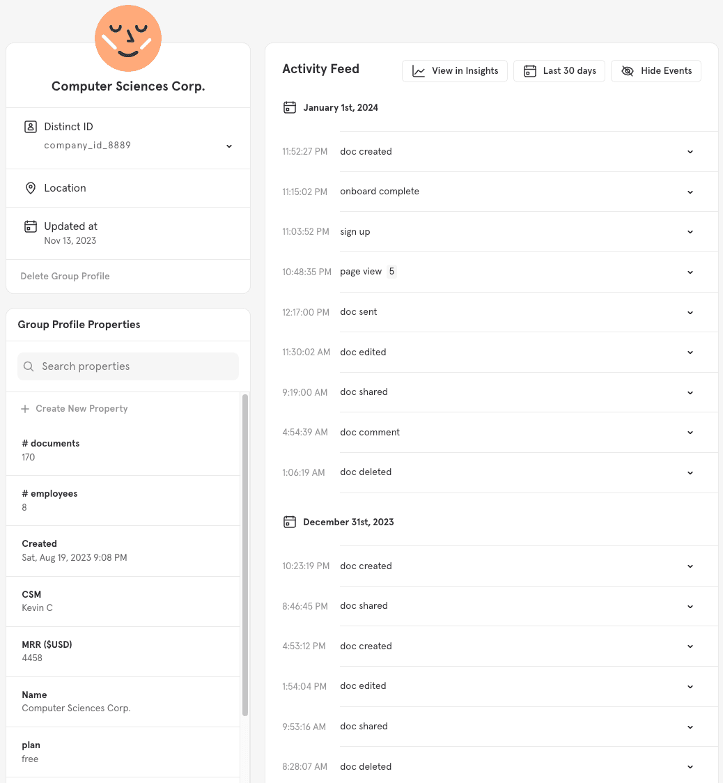 Much like a user profile, Group Profiles are a collection of properties and event history specific to a group.